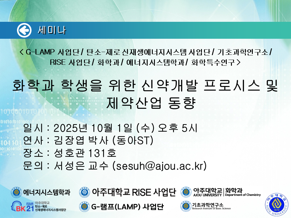 [2025.10.1.(수)] < G-LAMP 사업단 / 탄소-제로 신재생에너지시스템 사업단 / 기초과학연구소 / RISE 사업단 / 화학과 / 에너지시스템학과 / 화학특수연구 > 세미나 안내