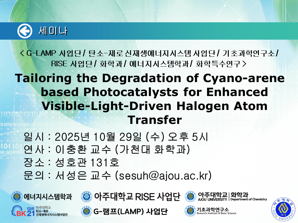 [2025.10.29.(수)] < G-LAMP 사업단 / 탄소-제로 신재생에너지시스템 사업단 / 기초과학연구소 / RISE 사업단 / 화학과 / 에너지시스템학과 / 화학특수연구 > 세미나 안내