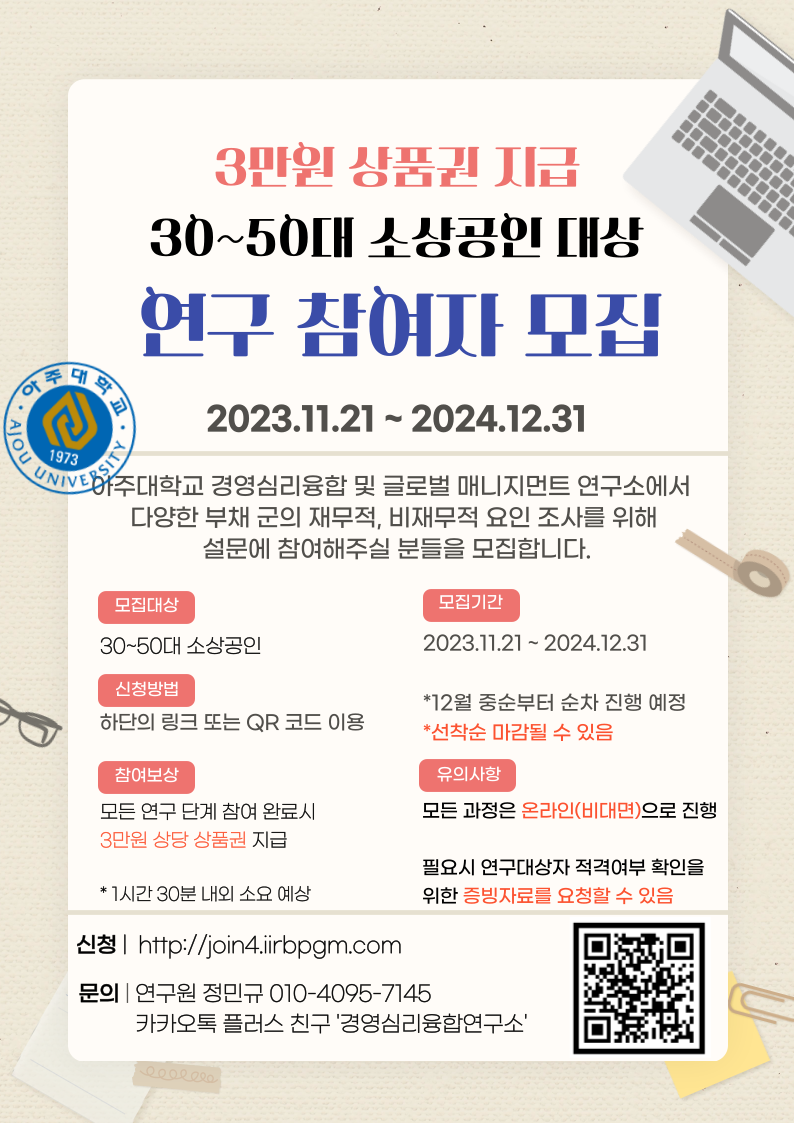 3만원 상품권 지급) 소상공인 대상 연구 참여자 모집
