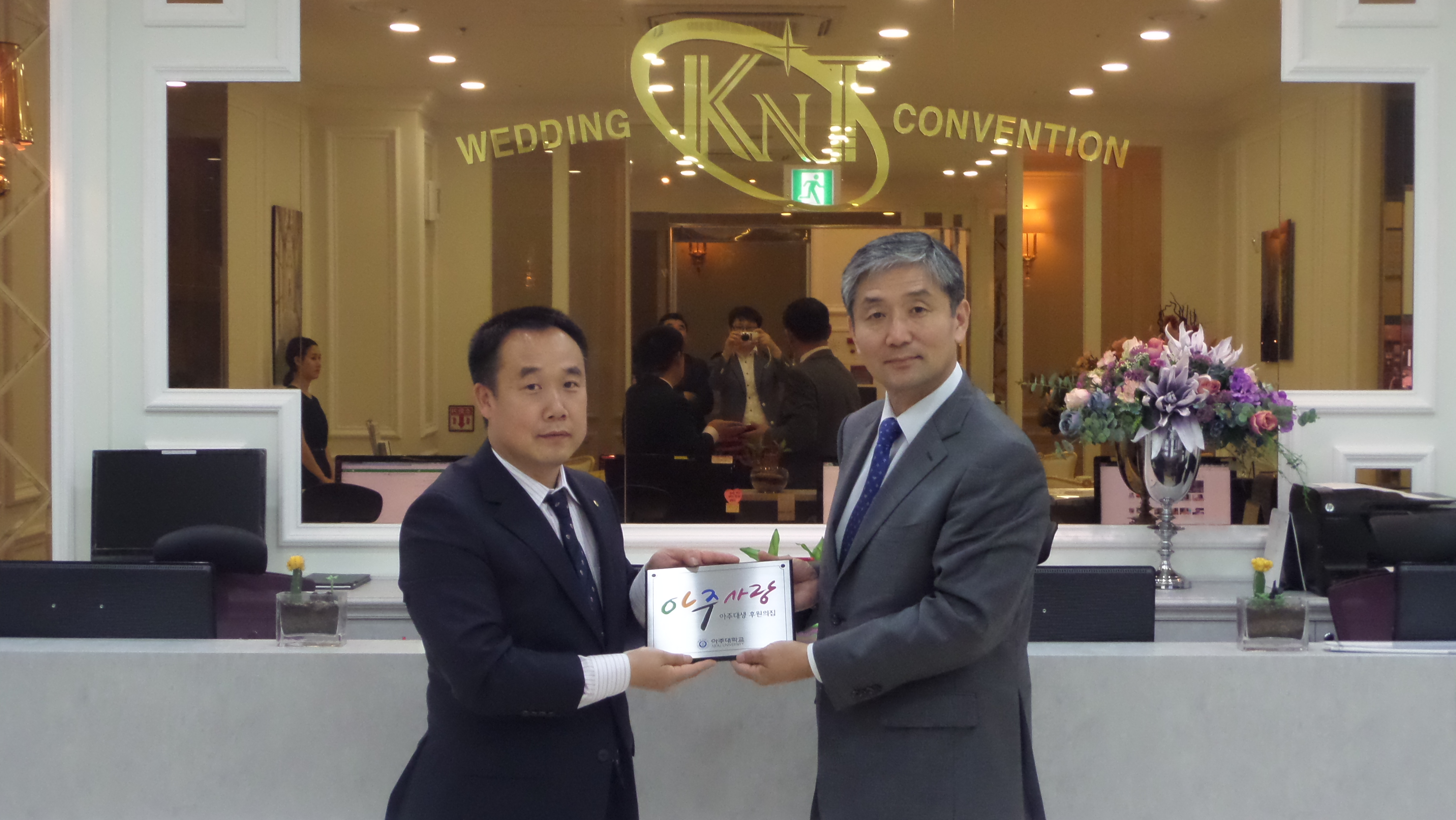 사진설명 : (왼쪽부터)한강* 대표, 김윤기 대학발전본부장, 지난 5월 27일 대학발전본부에서는 「아주대생 후원의 집」캠페인에 참여한 '커피에 반하다' 커피 판매점을 방문하고 현판식을 진행하였다. '커피에 반하다' 카페는 주고객인 학생들이 경제적 사정을 고려하여 '아메리카노'의 경우 1,000원, 1,500원 정도로 저렴하게 제공하고 있다. 특히, 커피 뿐만 아니라 요거트, 쥬스 등 대부분 메뉴도 3,000원 미만이며, 모든 메뉴를 바리스타인 주인장의 손으로 직접 만드는 1인 기업으로 학생들의 인기가 높은 업소이다. 전직 해병대 부사관 출신의 매우 건장한 체격인 한 대표는 수줍게 일행을 맞으며, 어려운 학생에게 도움을 주는 일에 동참하게 되어 일하는 보람을 더 많이 느낀다고 소감을 전하였다.