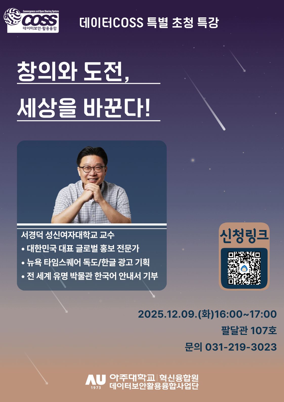 데이터보안·활용융합 혁신융합대학사업단에서 혁신적인 아이디어와 과감한 도전을 통해 K-Culture를 전 세계에 각인시킨 성신여자대학교 서경덕 교수님을 초청했습니다.
