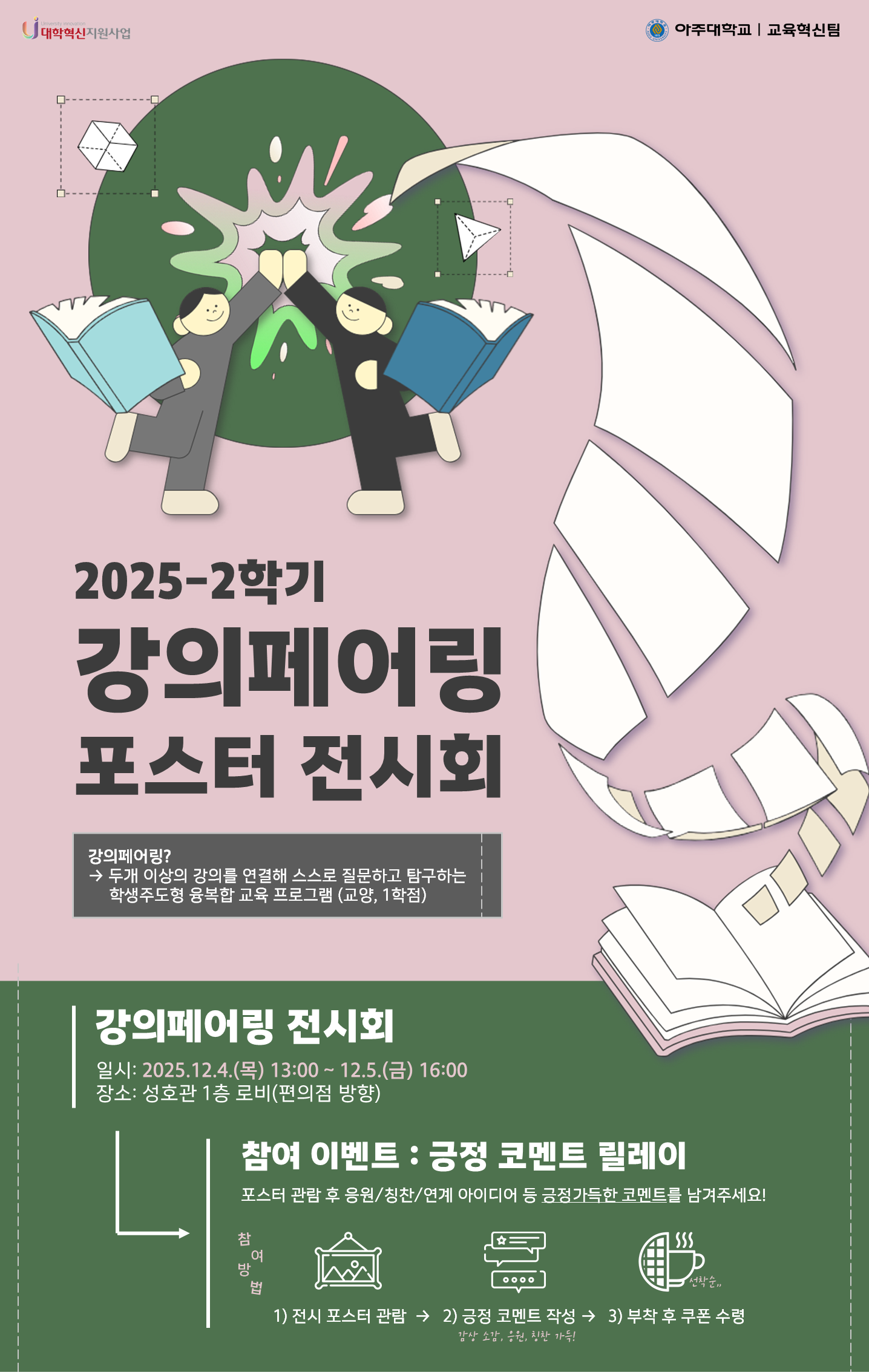 안녕하세요, 교육혁신팀입니다. 2025-2학기 제22회 강의페어링 포스터 전시회를 진행합니다.