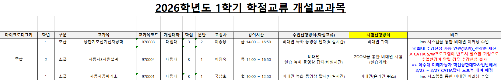 [학사] 2026학년도 1학기 미래자동차 학점교류(대림대학교) 신청 안내( 2/4 수 ~ 2/12 목 15:00 까지)