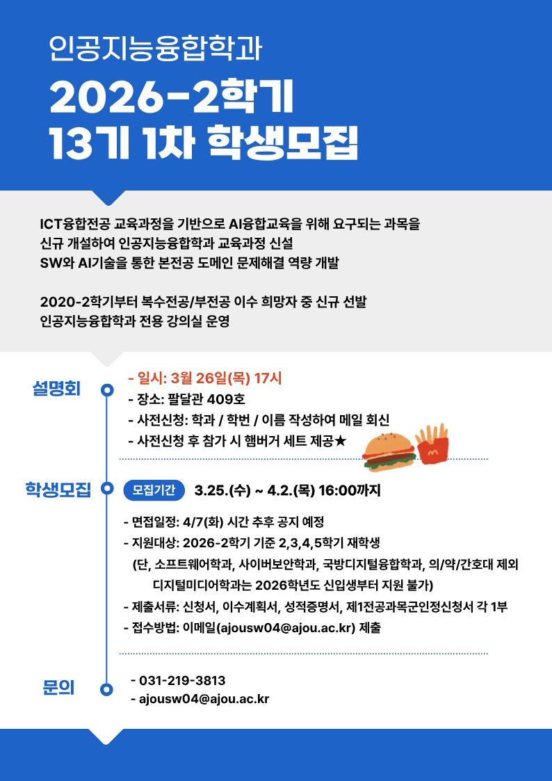 [ํ•™์‚ฌ] (๐Ÿ”๐ŸŸ์„ค๋ช…ํšŒD-3) ์ธ๊ณต์ง€๋Šฅ์œตํ•ฉํ•™๊ณผ 13๊ธฐ 1์ฐจ ํ•™์ƒ๋ชจ์ง‘[๋ณต์ˆ˜/๋ถ€์ „๊ณต]